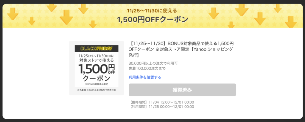 Yahoo!ショッピングのブラックフライデーは事前クーポンがあります。